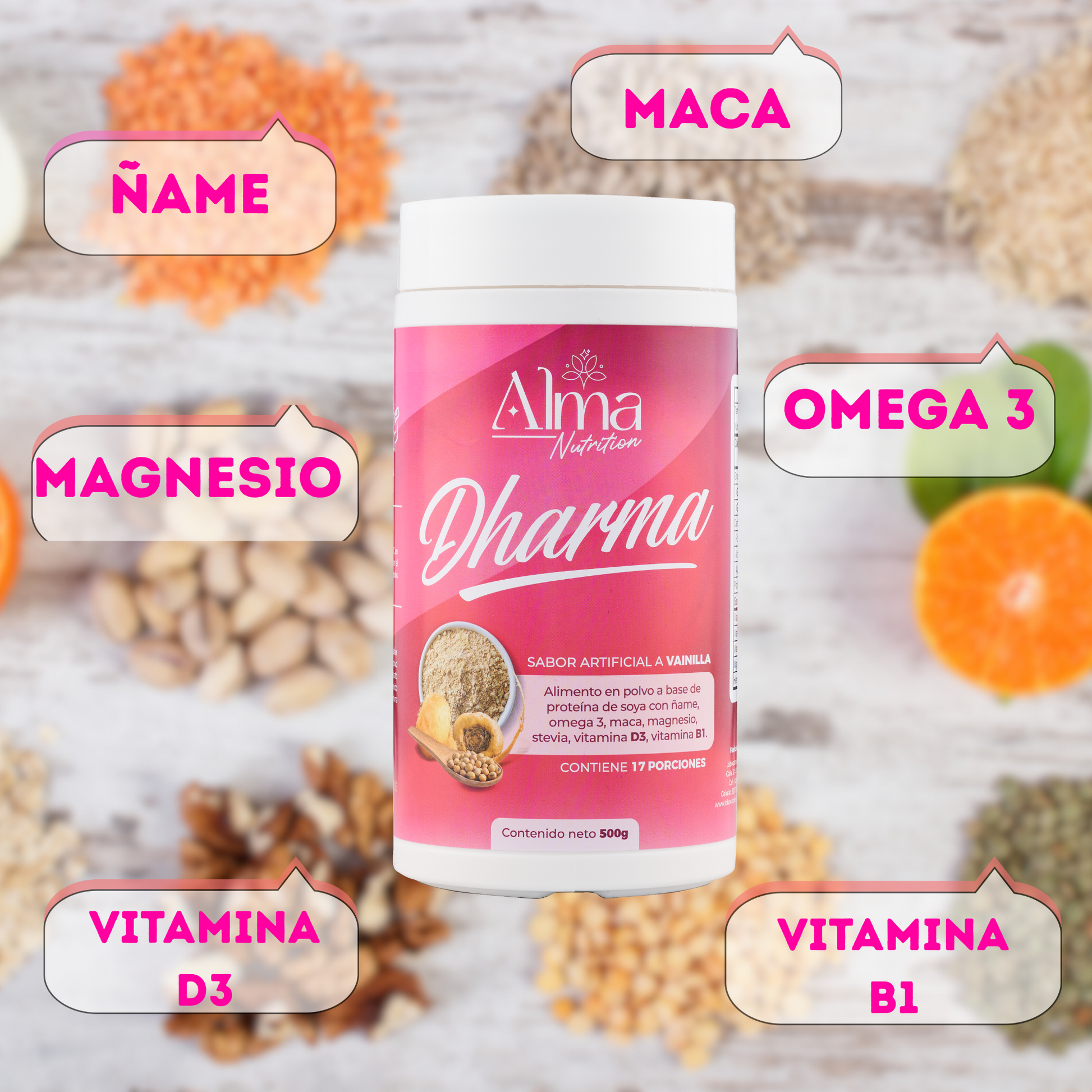 Dharma está formulado con una poderosa combinación de ingredientes 100% naturales, cuidadosamente seleccionados para apoyar el equilibrio hormonal femenino y mejorar tu calidad de vida durante la menopausia.